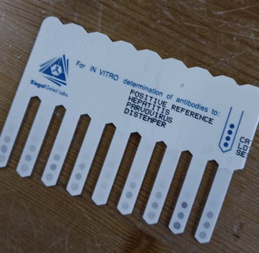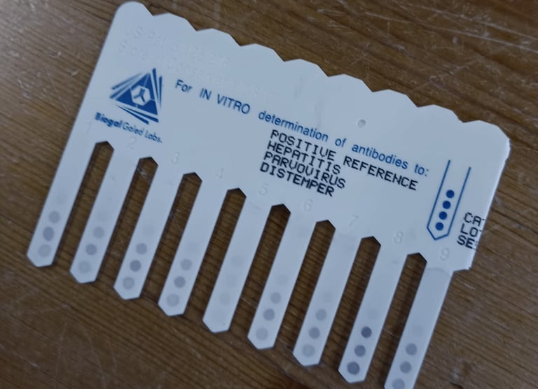 Ook titer ik nog steeds nestjes; op de foto een voorbeeld van de titeruitslagen van een nestje van 7 pupjes van 6 weken oud. Iedere pup heeft zijn eigen stripje. Alle pups hebben nog voldoende antistoffen en worden dus nog niet gevaccineerd. Herhaling van het titeren is in het geval van deze pupjes na 4 weken. Stripje 8 en 9 zijn de ouders; hen titer ik weer over 3 jaar.